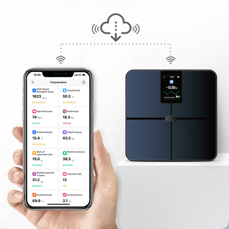 Denne vægt giver dig ikke bare en almindelig vægtmåling, men leverer hele 25 forskellige kropsanalyser på få sekunder, såsom fedtprocent, muskelmasse, vandforhold, sundhedscore, kropsalder og meget mere. Sig farvel til gætværk, og forstå samt forbedr din krops sundhed med SmartScale.